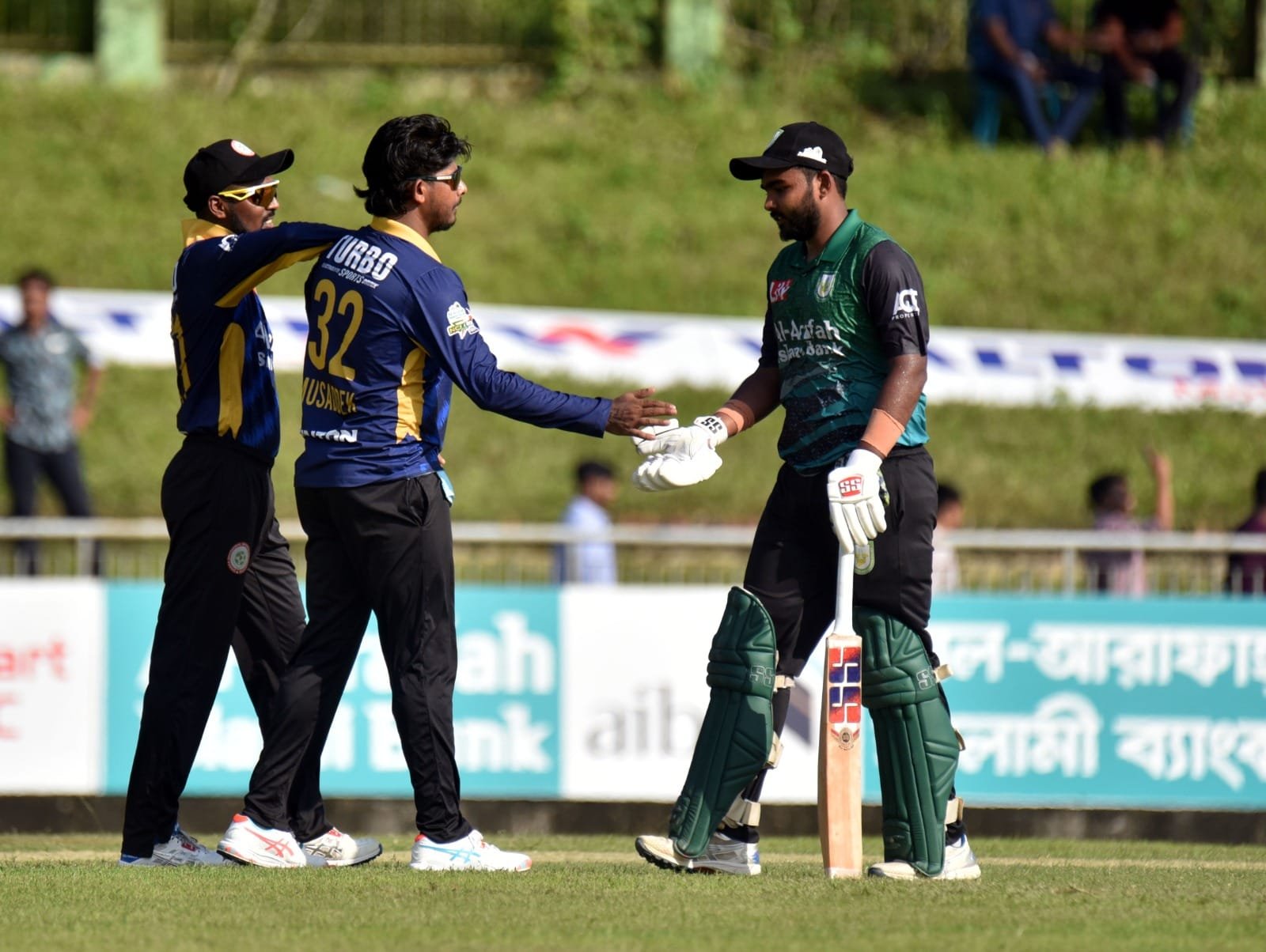 গালিব-অমিতের ফিফটির সাথে রেজাউর রহমান রাজা করেন ১৫ রান। ঢাকার হয়ে ৩ উইকেট নেন মোসাদ্দেক হোসেন। ২ উইকেট নেন মাহফুজুর রাব্বি। রান তাড়ায় উড়ন্ত সূচনা পায় ঢাকা। শিবলির ৩৯ বলে ৬০ রান ও রাফসান আল মাহমুদ-আরিফুল ইসলামের ব্যাটে ১৮ বল হাতে রেখে জয় পায় দলটি। রাফসান করেন ৪৫ বলে ৪৬ রান। আরিফুল করেন ১৮ বলে ২৬ রান।