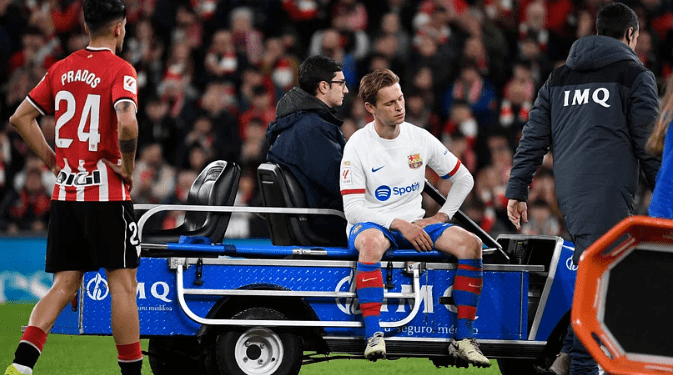বিলবাওয়ের মাঠে প্রথমার্ধে বার্সার দুই গুরুত্বপূর্ণ ফুটবলার ফ্রেঙ্কি ডি ইয়ং ও পেদ্রি চোটে পড়ে মাঠ ছাড়তে বাধ্য হয়েছেন। ২৬ মিনিটে মাঠ ছেড়েছেন ডি ইয়ং এবং পেদ্রি ৪৫ মিনিটে মাঠ ছাড়েন। ২৪তম মিনিটে প্রথম ধাক্কা খায় কাতালনরা। বল দখলের লড়াইয়ে লাফিয়ে বাজেভাবে পড়ে অ্যাঙ্কেলে চোট পান ডি ইয়ং। মাঠে চিকিৎসা নিয়েও আর খেলা চালিয়ে যেতে পারেননি এই ডাচ মিডফিল্ডার। তার বদলি নামেন তরুণ স্প্যানিশ মিডফিল্ডার ফেরমিন লোপেস।