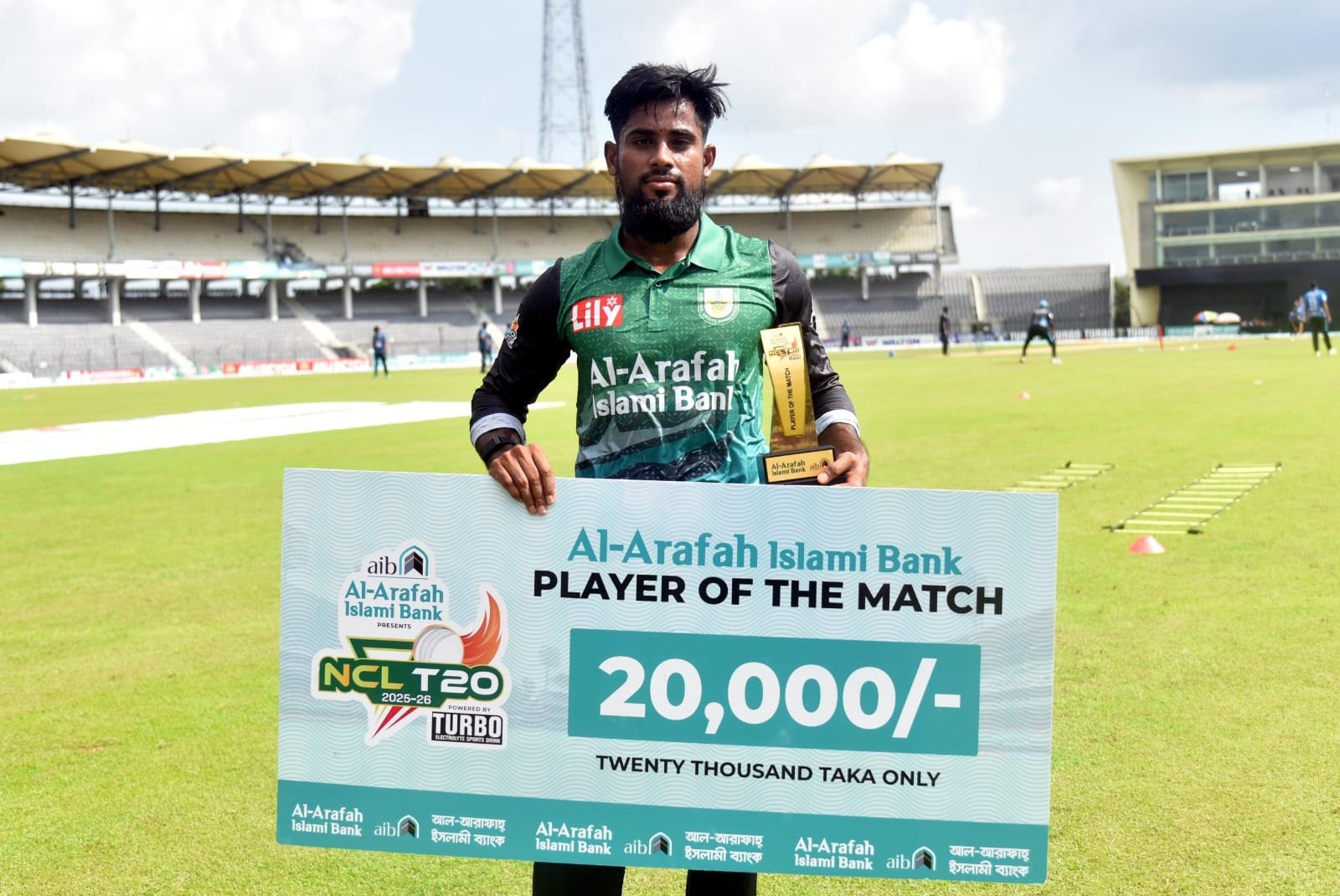 নিজস্ব প্রতিবেদকঃ এনসিএল টি-টোয়েন্টিতে ঘরের মাঠে শ্বাসরুদ্ধকর জয় পেয়েছে সিলেট বিভাগ। শনিবার সিলেট আন্তর্জাতিক ক্রিকেট স্টেডিয়ামে শেষের নাটকে জিতেছে স্বাগতিকরা। তাদের ২ উইকেটের জয়ে নায়ক পেসার রেজাউর রহমান রাজা। বল হাতে ১ উইকেট শিকারের পর ব্যাট হাতে সিলেটকে জিতিয়ে মাঠ ছাড়েন ডানহাতি এই ক্রিকেটার।