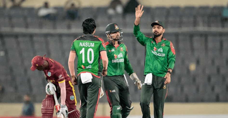 ২৯৭ রানের টার্গেটে ব্যাট করতে নামা ওয়েস্ট ইন্ডিজ টাইগারদের বোলিং তোপে পড়ে। নাসুম, রিশাদ ও মিরাজদের স্পিন ঘূর্ণিতে দিশেহারা ক্যারিবিয়ানরা মাত্র ১১৭ রানে গুটিয়ে গেছে ৩০.১ ওভারে।
